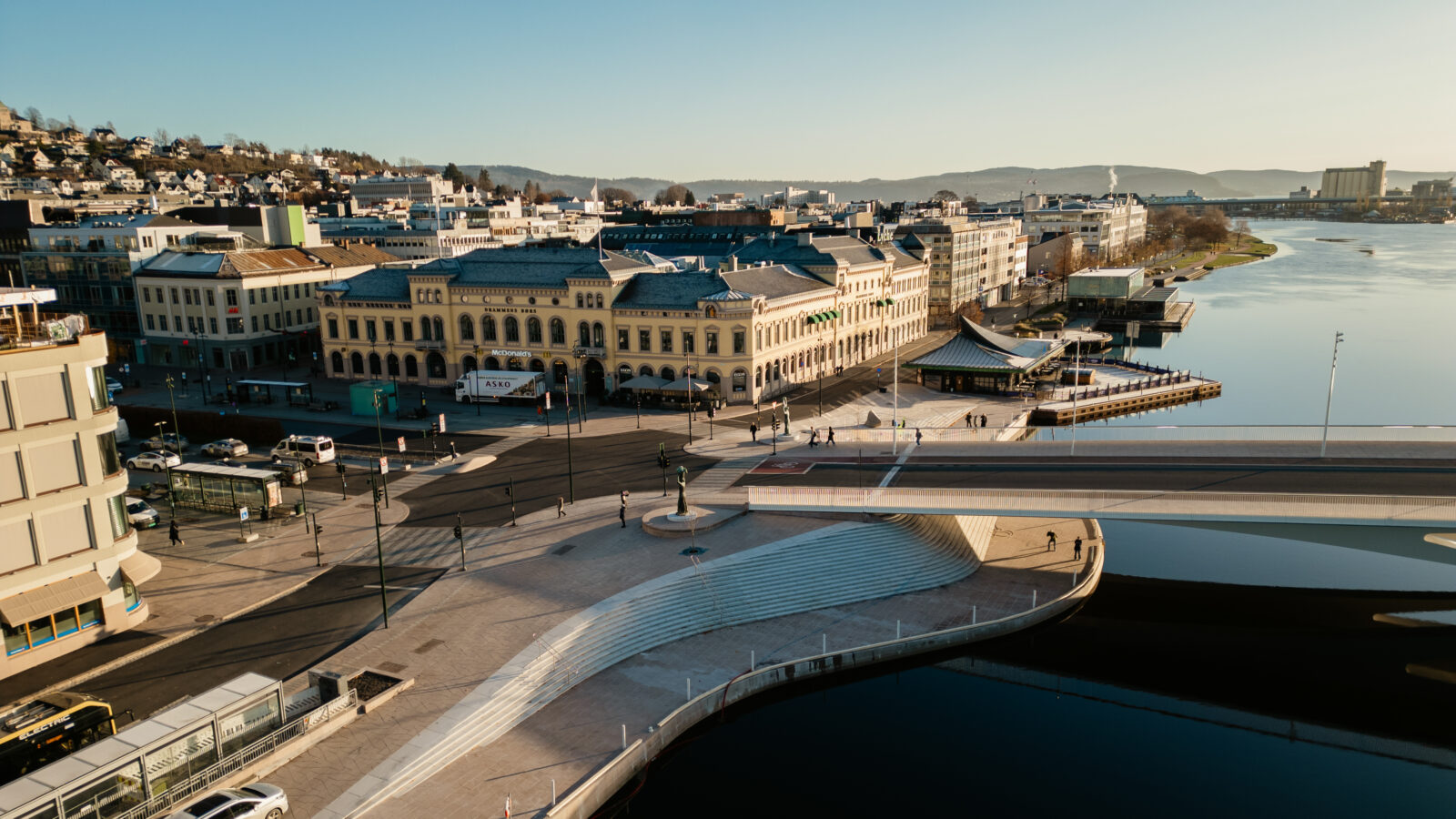 Drammen har fått ny bybru i verdensklasse. Og på hver side, hvor bru møter land, ligger byens nye byrom som brua forener til det som muligens er Nord-Europas lengste torg.