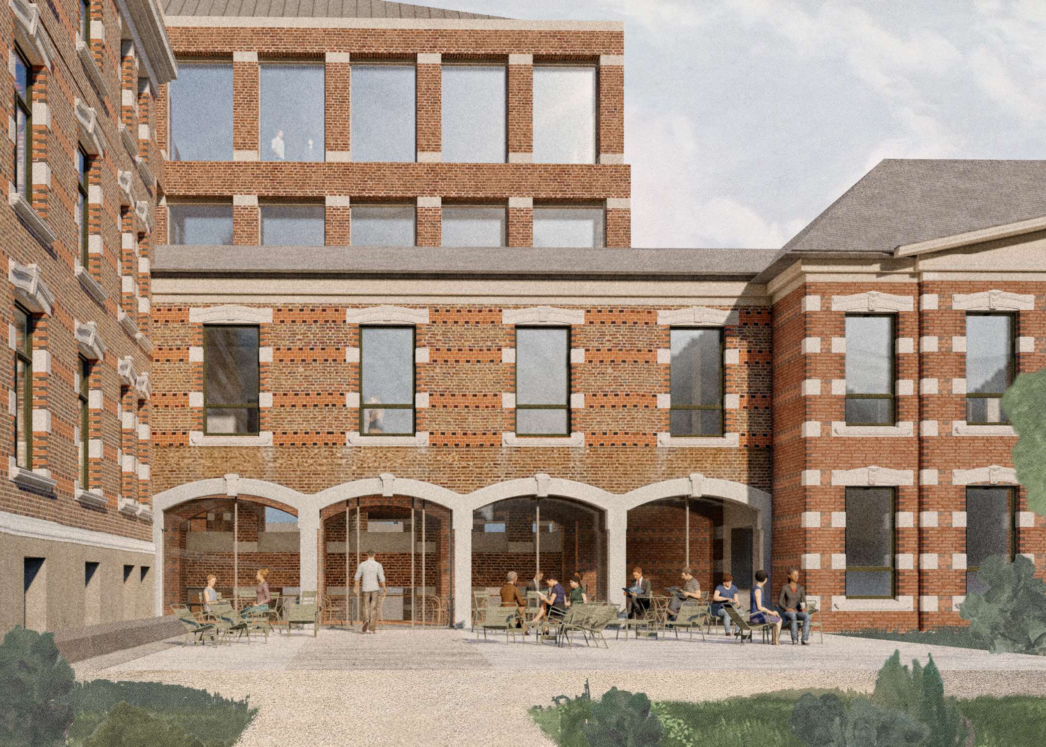 Arkitekten valgte å forlenge det eksisterende bygget og binde det nye og gamle sammen med en trefasade. Et av de viktigste grepene som ble gjort var å gi bygget større vinduer, sånn at kontakten med landskapet utenfor blir tydeligere.