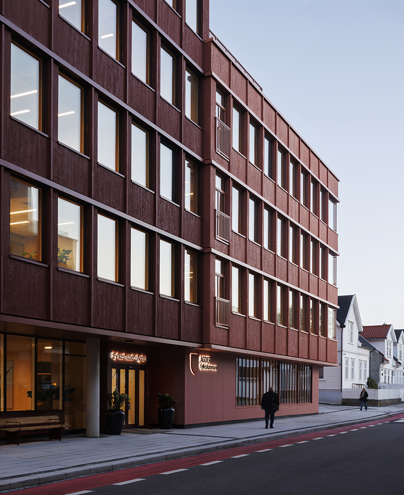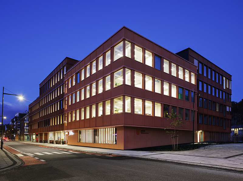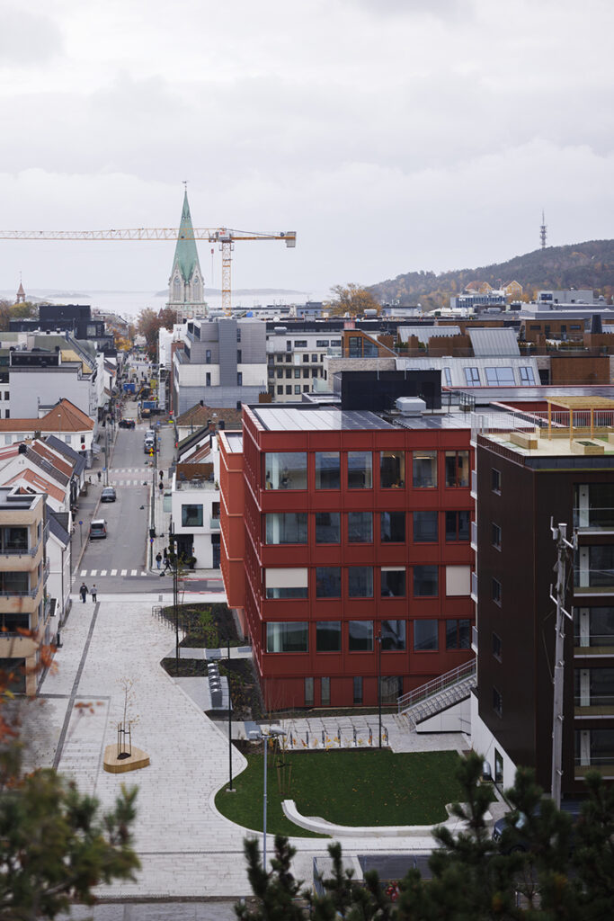 Sokkeletasjen dekker hele kvartalet og inneholder stor møte- og konferanseavdeling, fylkestingssal og kantine. Et atrium med amfitrapp opp til felles gårdsrom slipper lys ned til fellesarealene. Leilighetene har terrasser mot ettermiddagssolen og utsikt mot Baneheia. Prosjektet har trekledning for å tilpasse arkitekturen til øvrig bebyggelse i Nybyen, samtidig som trekledningen samsvarer med de meget høye ambisjonene for lavt klimagassutslipp. Fylkeshuset er plusshus.
