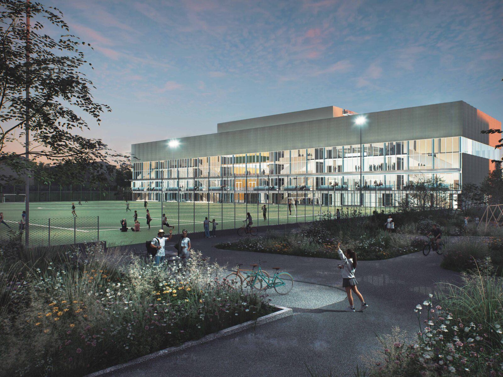 Arenaen ligger sørvendt, sprengt inn i knauselandskapet, med et lite tjern i forkant som det nye par- og aktivitetsområdet snor seg rundt. Ny adkomstsituasjon og oppgradering av snusløyfe og parkeringsplass binder anlegget sammen med ungdomsskolen.