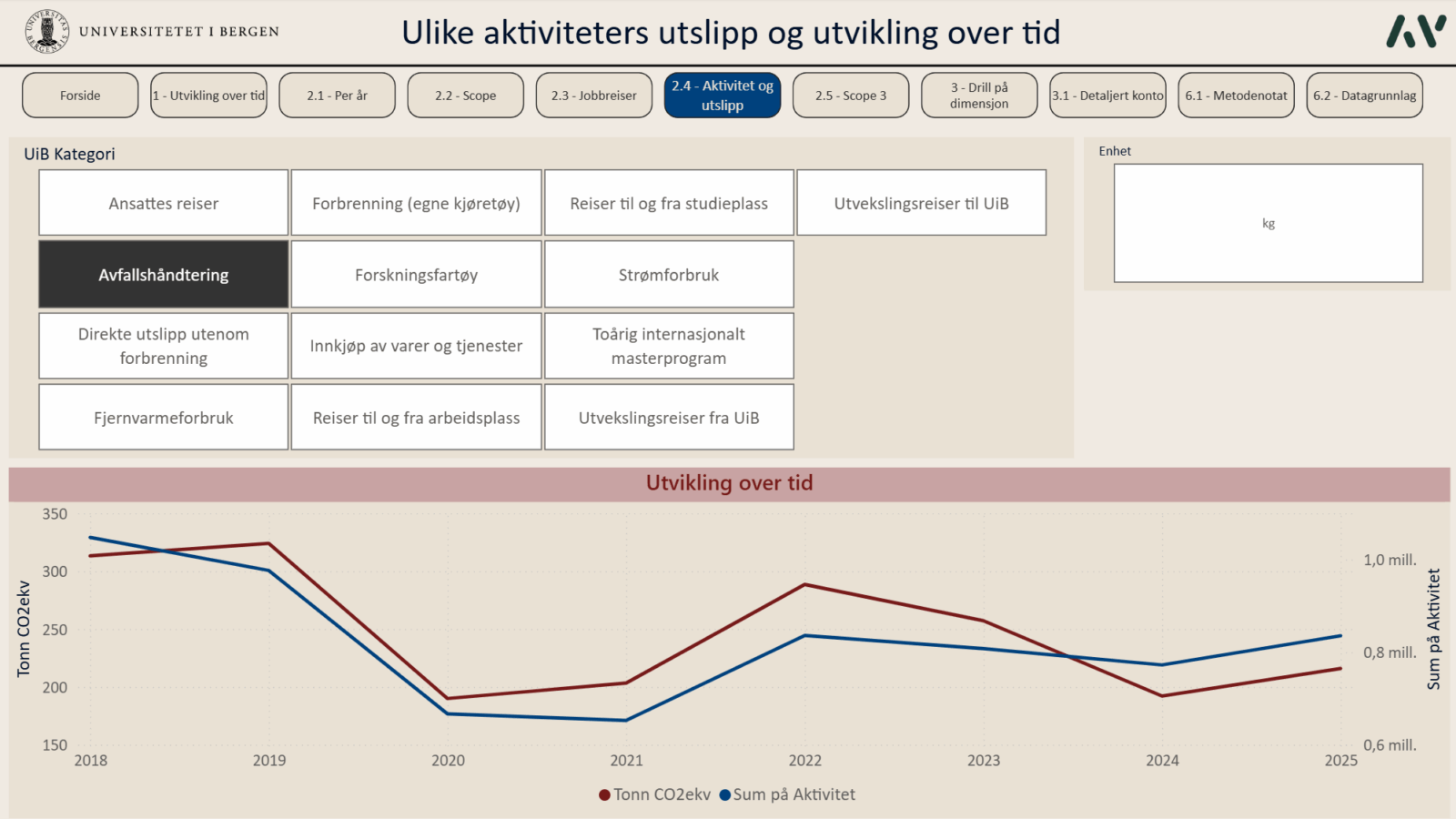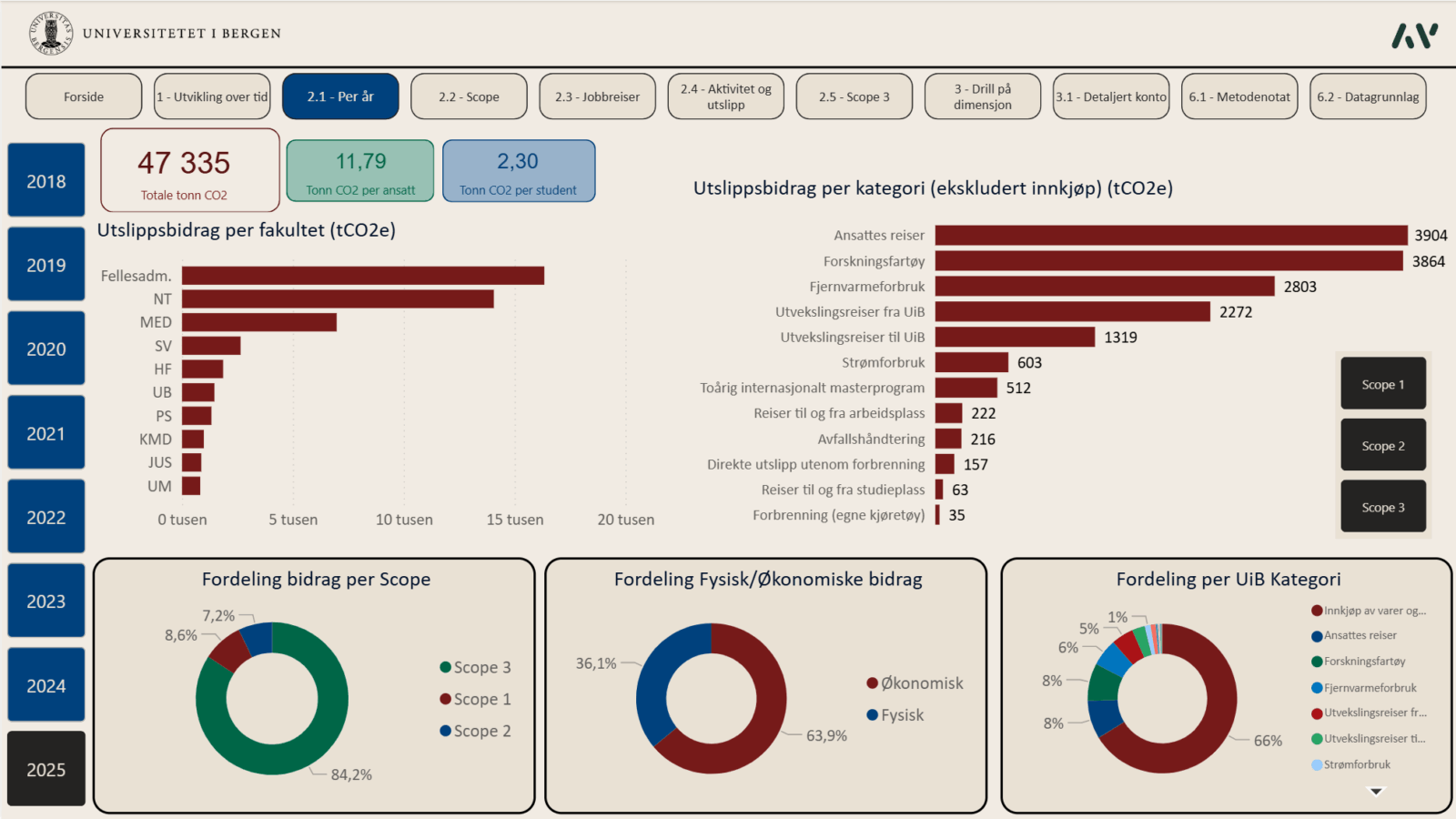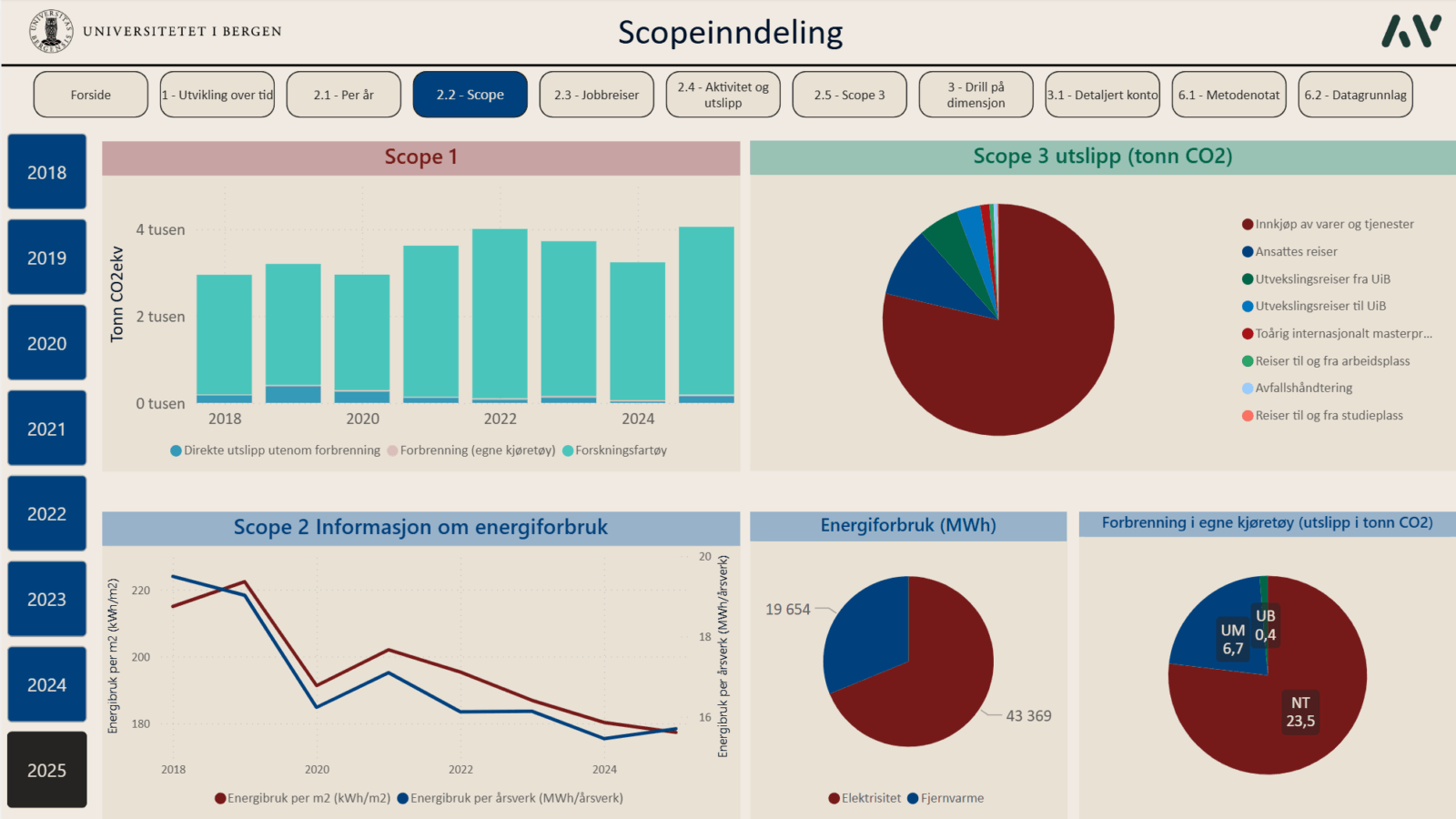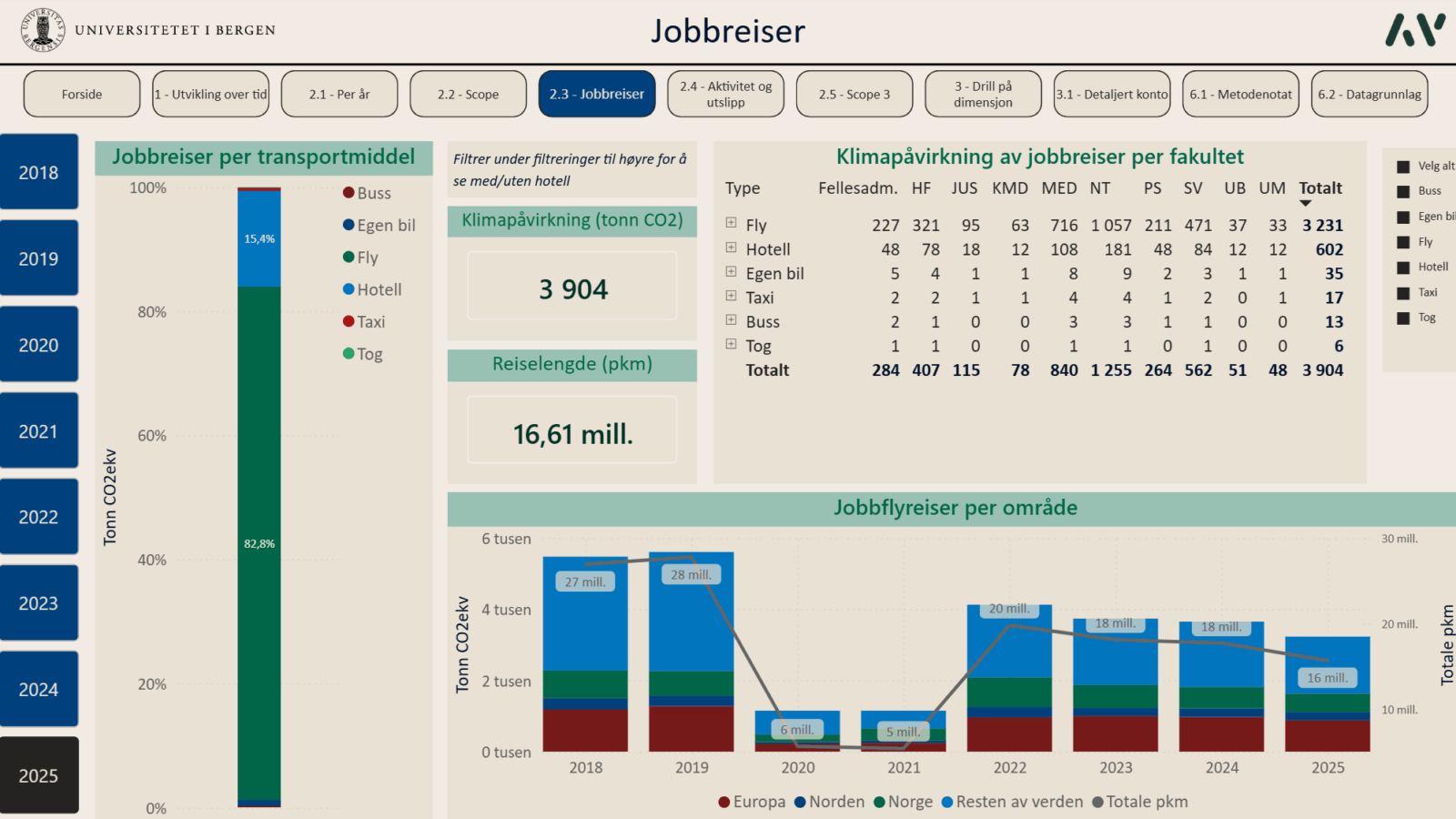 Siden 2019 har Asplan Viak bistått universitetet i Bergen (UiB) med å utarbeide et årlig klimaregnskap som omfatter hele virksomhetens aktiviteter – fra forskningsfartøy og laboratorier til innkjøp, flyreiser og pendling. I 2026 ble det for første gang levert et klimaregnskap i Microsoft Power BI, med Klimakost-metodikken i bunn.