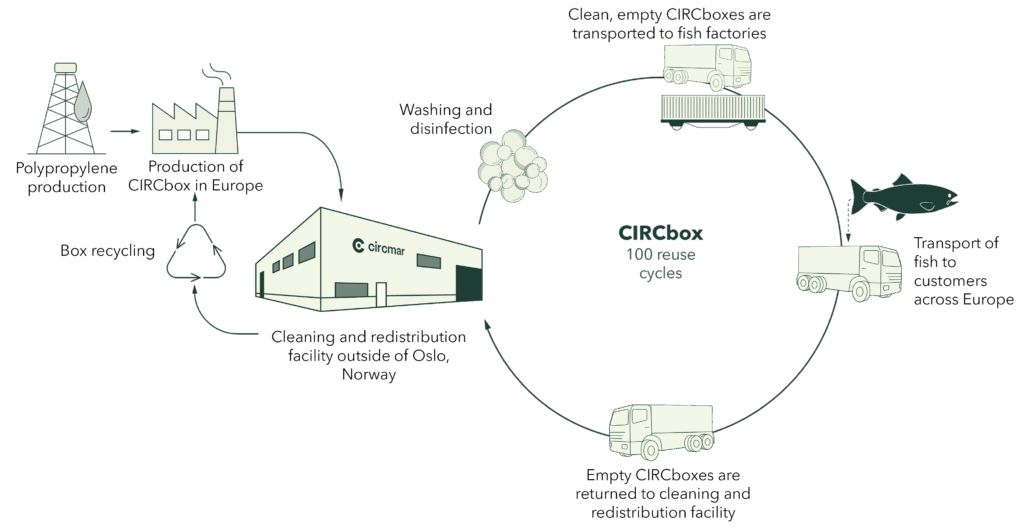 Sirkulæritet starter allerede når et produkt designes. CIRCbox er nettopp det – en fiskekasse designet for ombruk, som kan erstatte den tradisjonelle engangs EPS-fiskekassen. CIRCbox kan gjenbrukes mer enn 100 ganger, og etter dette sendes de til resirkulering for produksjon av nye kasser.