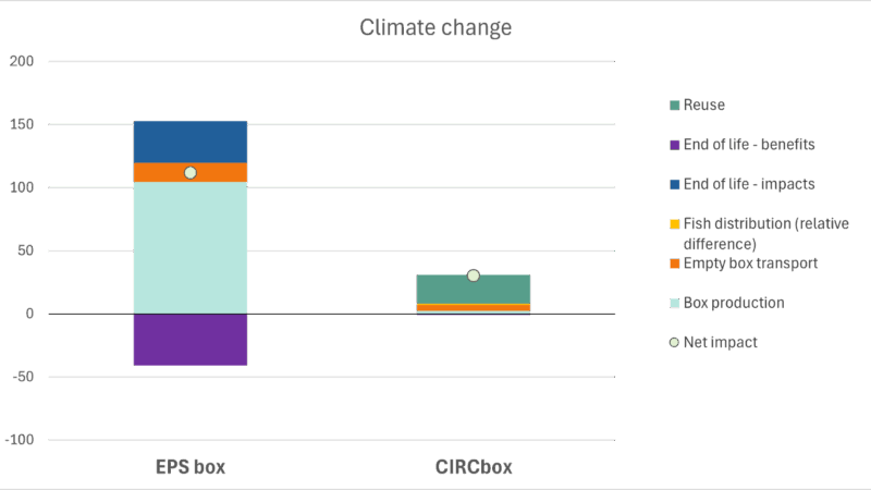 For EPS-kassen står produksjon og avfallshåndtering for størsteparten av påvirkningen, ettersom det produseres en ny kasse per forsendelse av fisk. Ettersom CIRCbox kan gjenbrukes over 100 ganger, blir miljøpåvirkningen fra produksjon og avfallshåndtering av kassen minimale når man ser på miljøpåvirkningen tilknyttet å transportere 1 kg fisk, som i denne analysen.